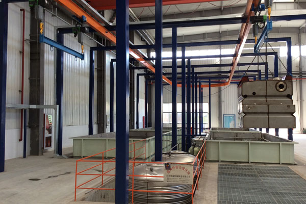 前處理生產(chǎn)線結(jié)構(gòu)特點(diǎn)是:前處理生產(chǎn)線各工序噴淋管布置在隧道內(nèi),噴淋由各液槽的泵來提供.各工序間都有門洞板隔開,以防竄液.各加熱液槽的加熱形式有槽內(nèi)和槽外。內(nèi)加熱器有排管、蛇形管、波紋板等;外加熱器有列管、板式加熱器等。加熱介質(zhì)有熱水 、蒸汽、導(dǎo)熱油等。在脫脂、磷化工序分別設(shè)有除油系統(tǒng)和除渣系統(tǒng)。為防止各加熱段隧道頂部及門洞處溢出蒸汽,在隧道頂部設(shè)有排風(fēng)機(jī)。